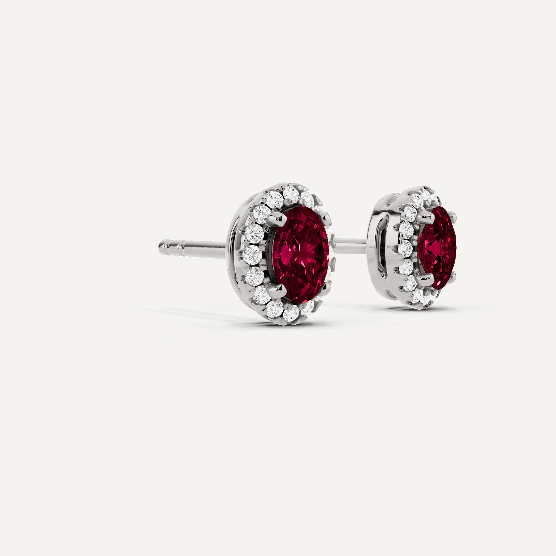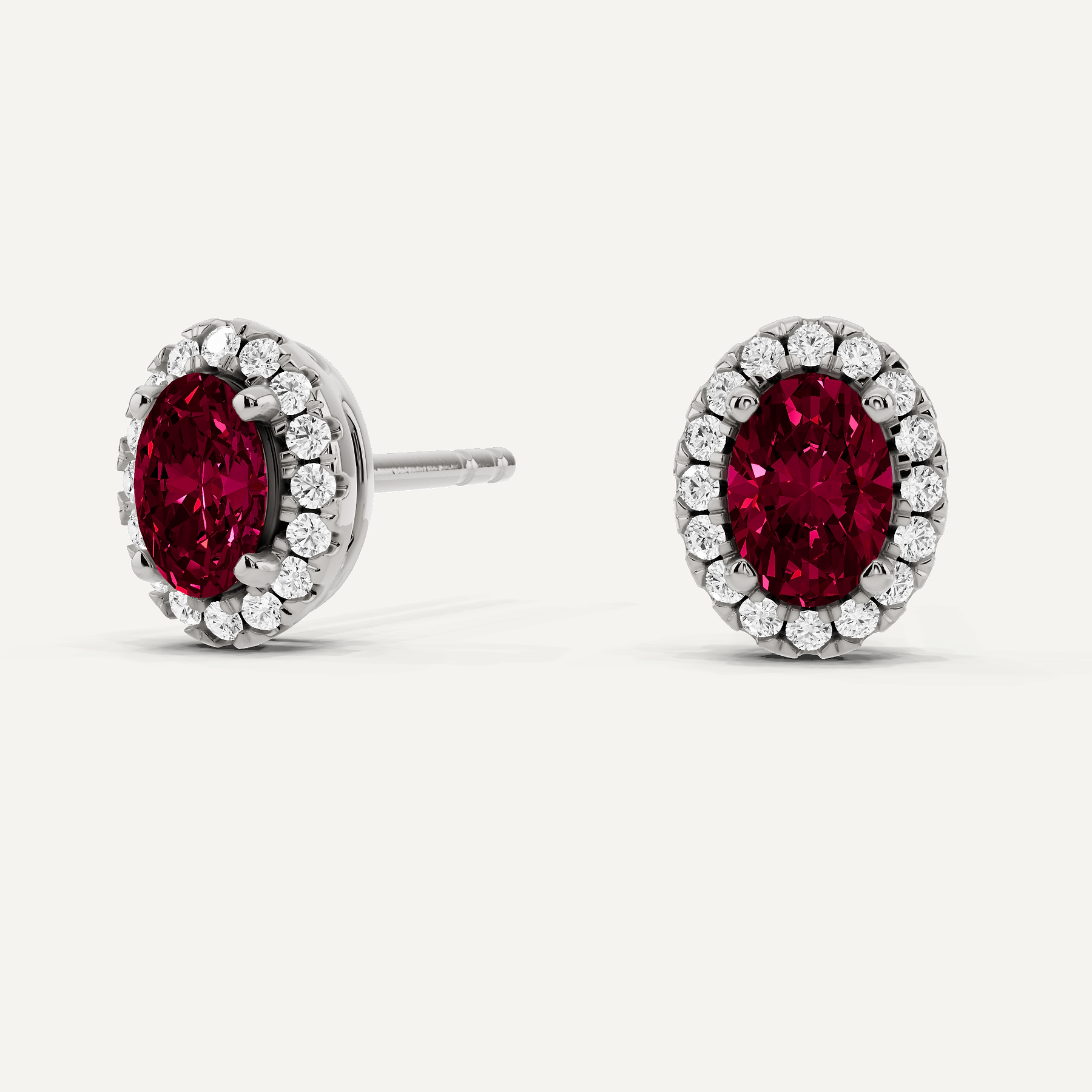 Enhance your everyday studs with these halo Ruby stud earings. Each large oval lab grown Ruby is encircled with enchanting smaller Rubys to create a halo effect.
