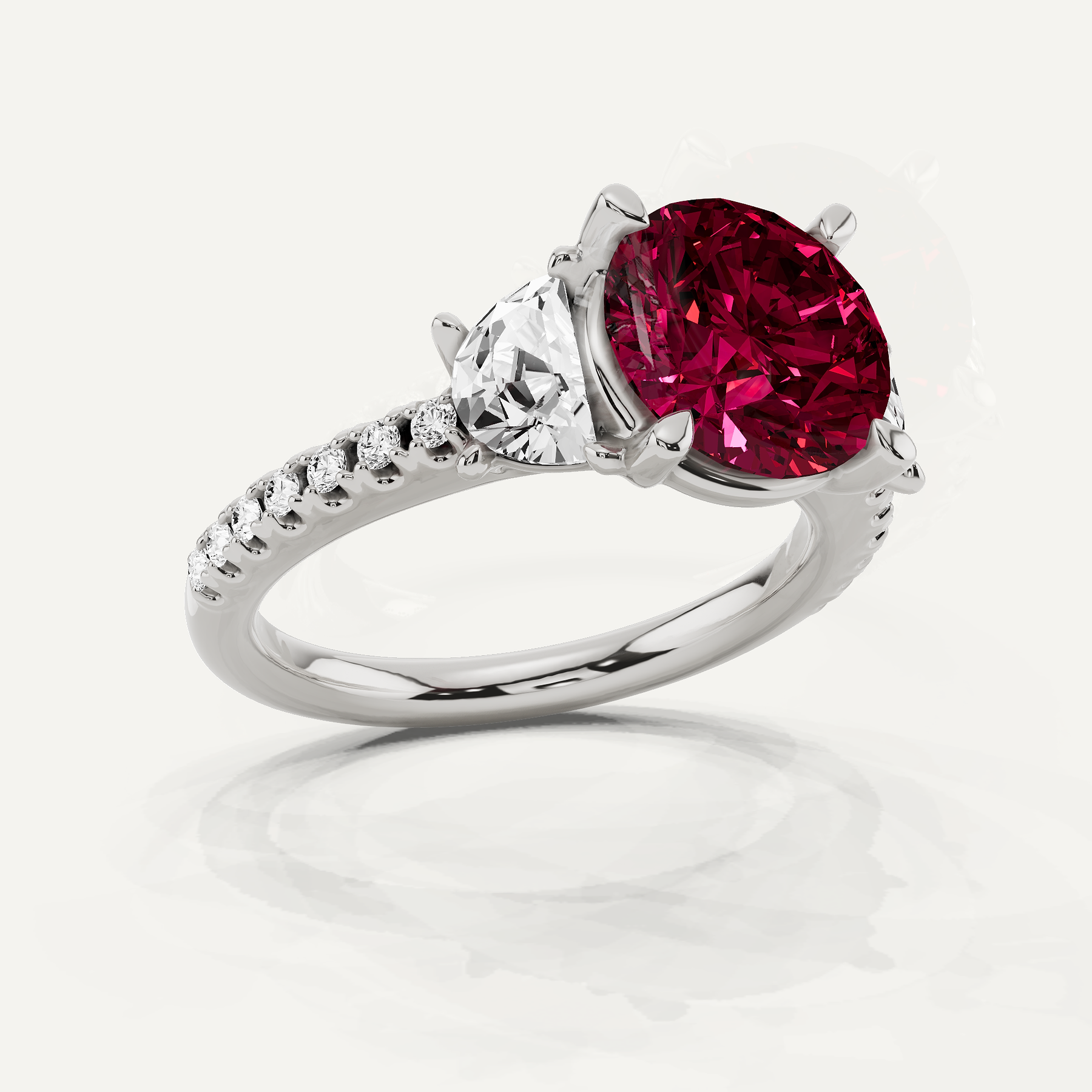 3 ctw Round Created Ruby Three Stone Engagement Ring With Half Moon Sides