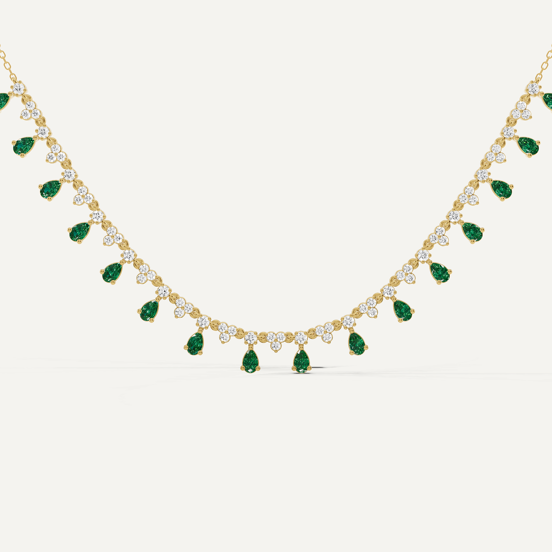 This necklace unfolds like a story of luminous transformation, where every detail whispers of artistry. Set in 10K yellow gold, the pear-shaped emeralds total 2.0 ctw, cascading in a fluid design that mirrors nature's elegant forms. Meticulously crafted, it captures a moment of organic beauty, meant to adorn with poise and sentiment.