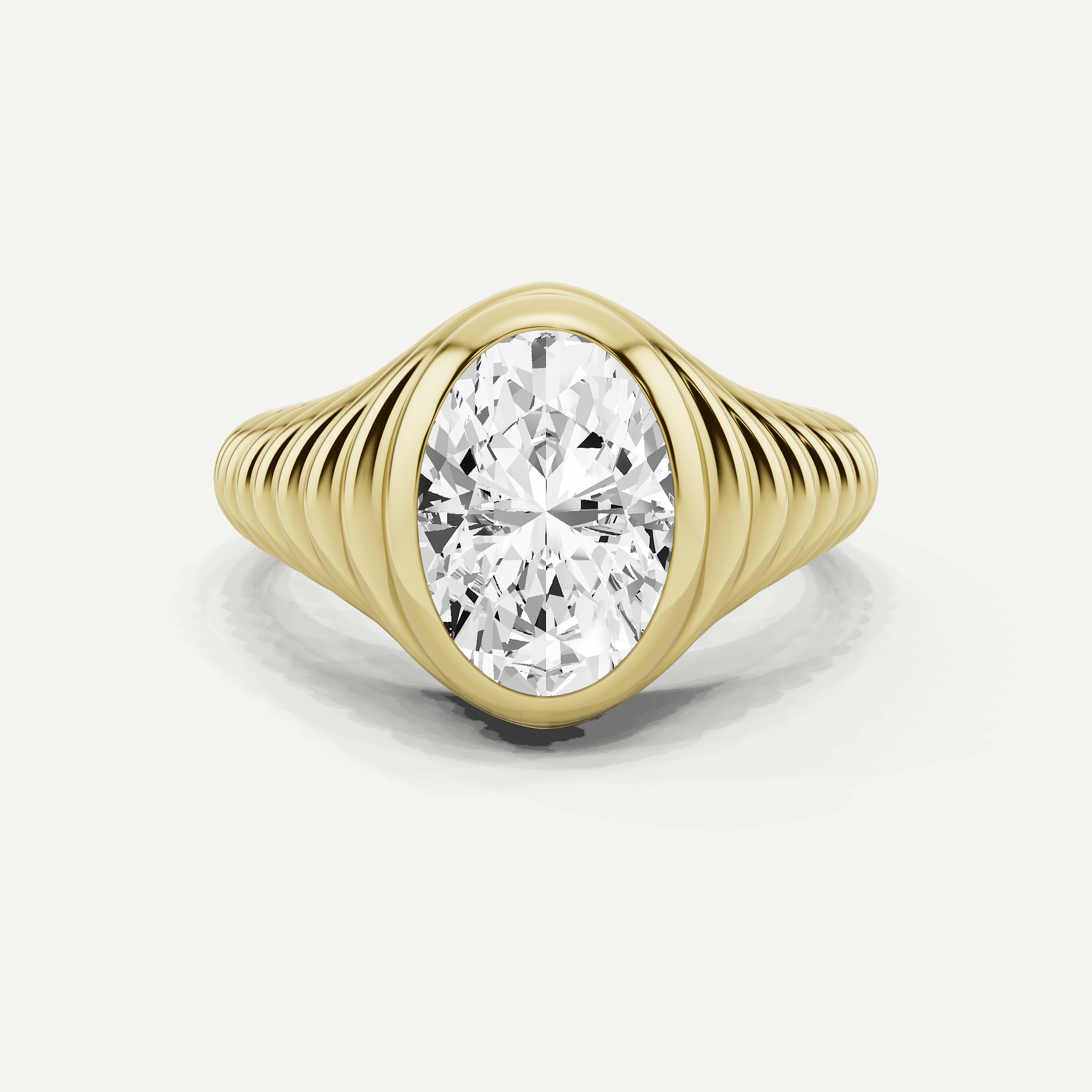 In this men's ring, bold simplicity meets unyielding craftsmanship. The 2 ctw oval lab grown diamond is gracefully encased in a bezel setting, embraced by the understated strength of 14K white gold. A timeless symbol of individuality and elegance, this design is as striking as it is enduring.