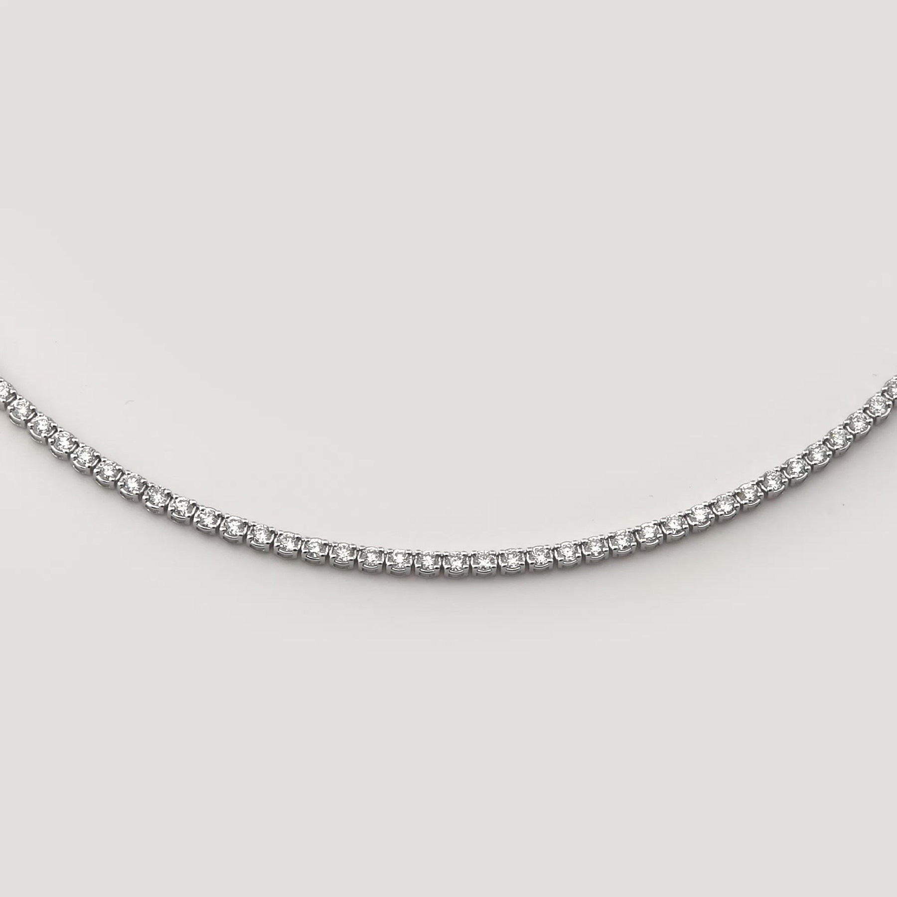 Crafted to evoke a sense of quiet magnificence, this necklace is a celebration of light and form. The 10.0 ctw round stones shimmer against a backdrop of silver, their brilliance dancing like constellations on a starlit evening. Every link is masterfully forged, weaving artistry and precision into a chain that feels like poetry against the skin.