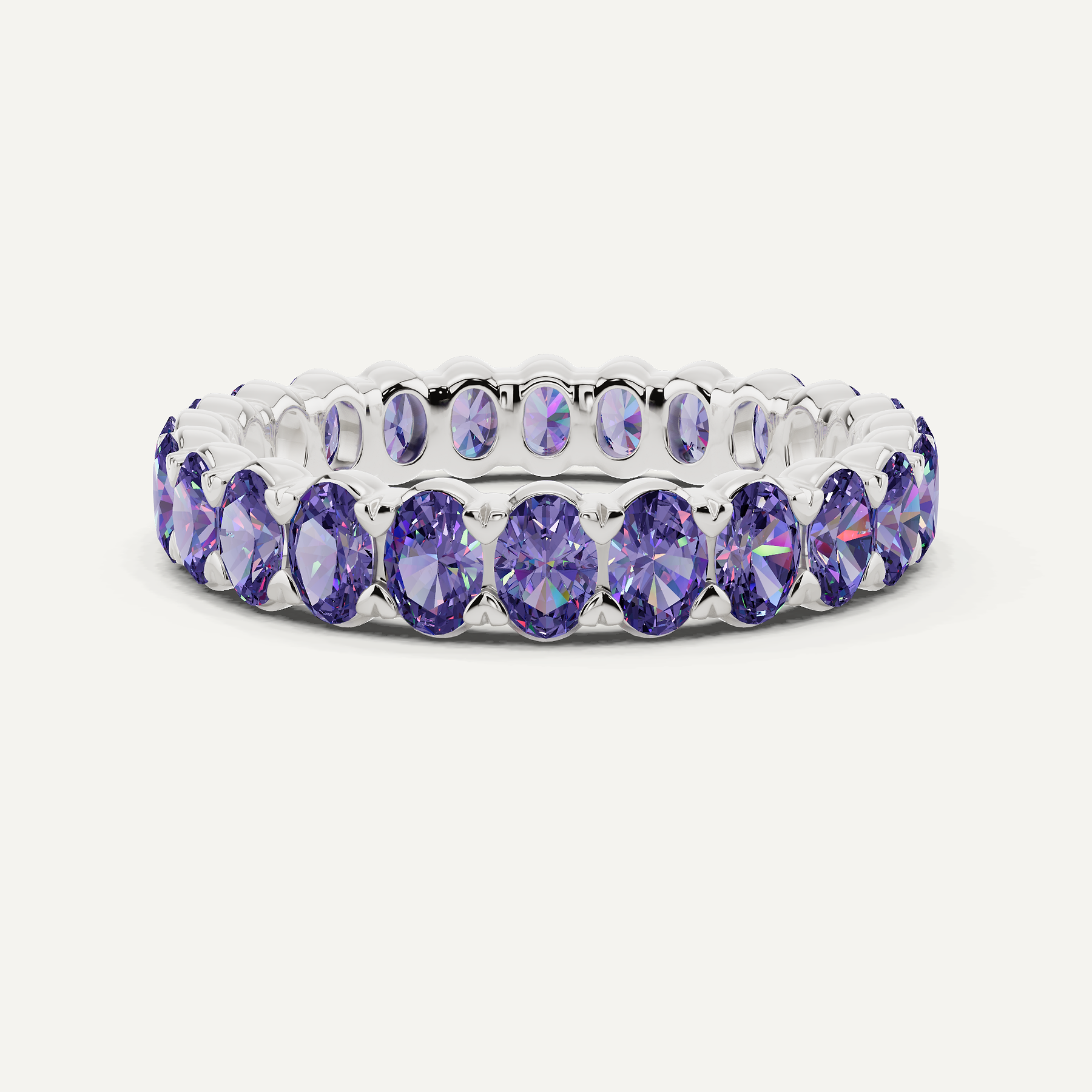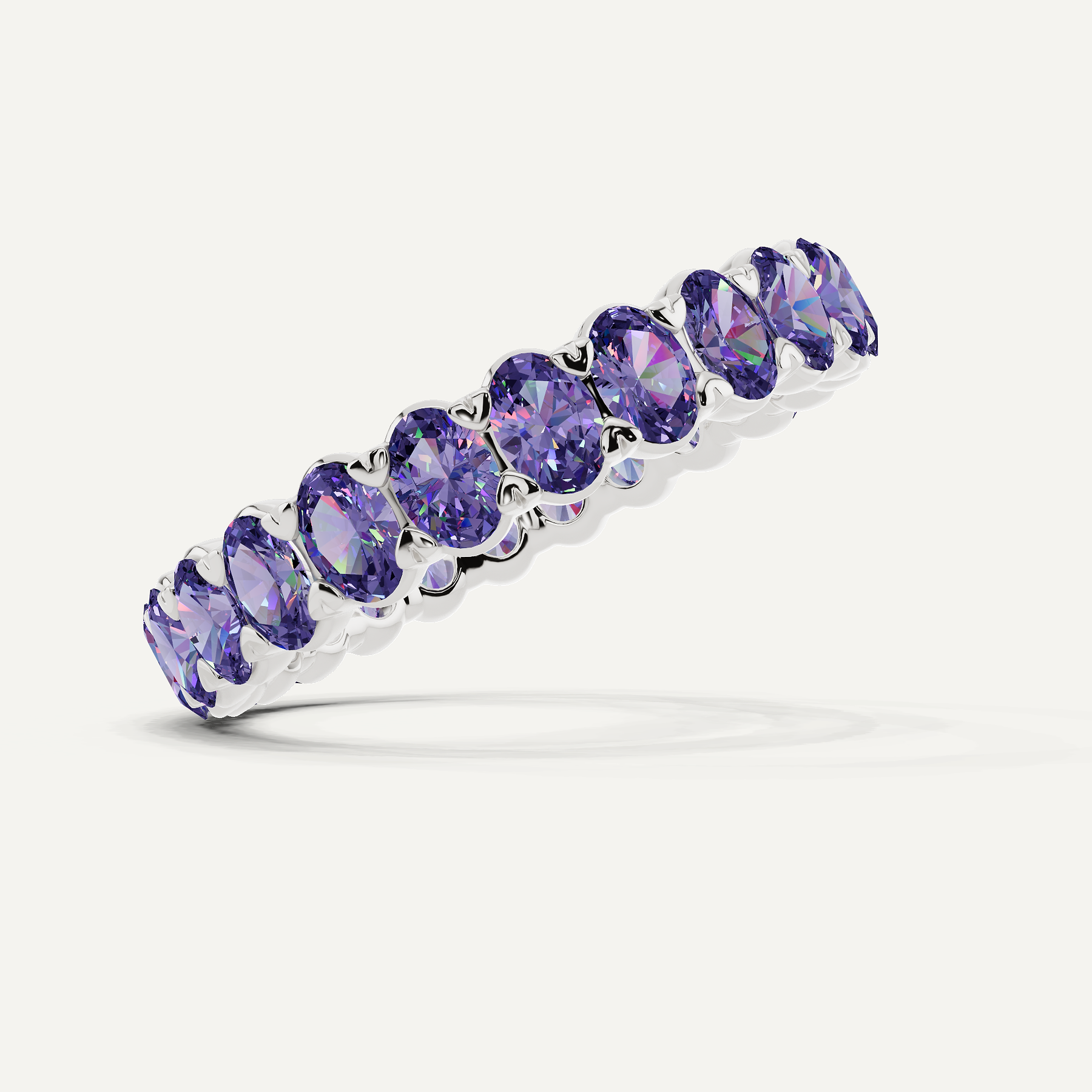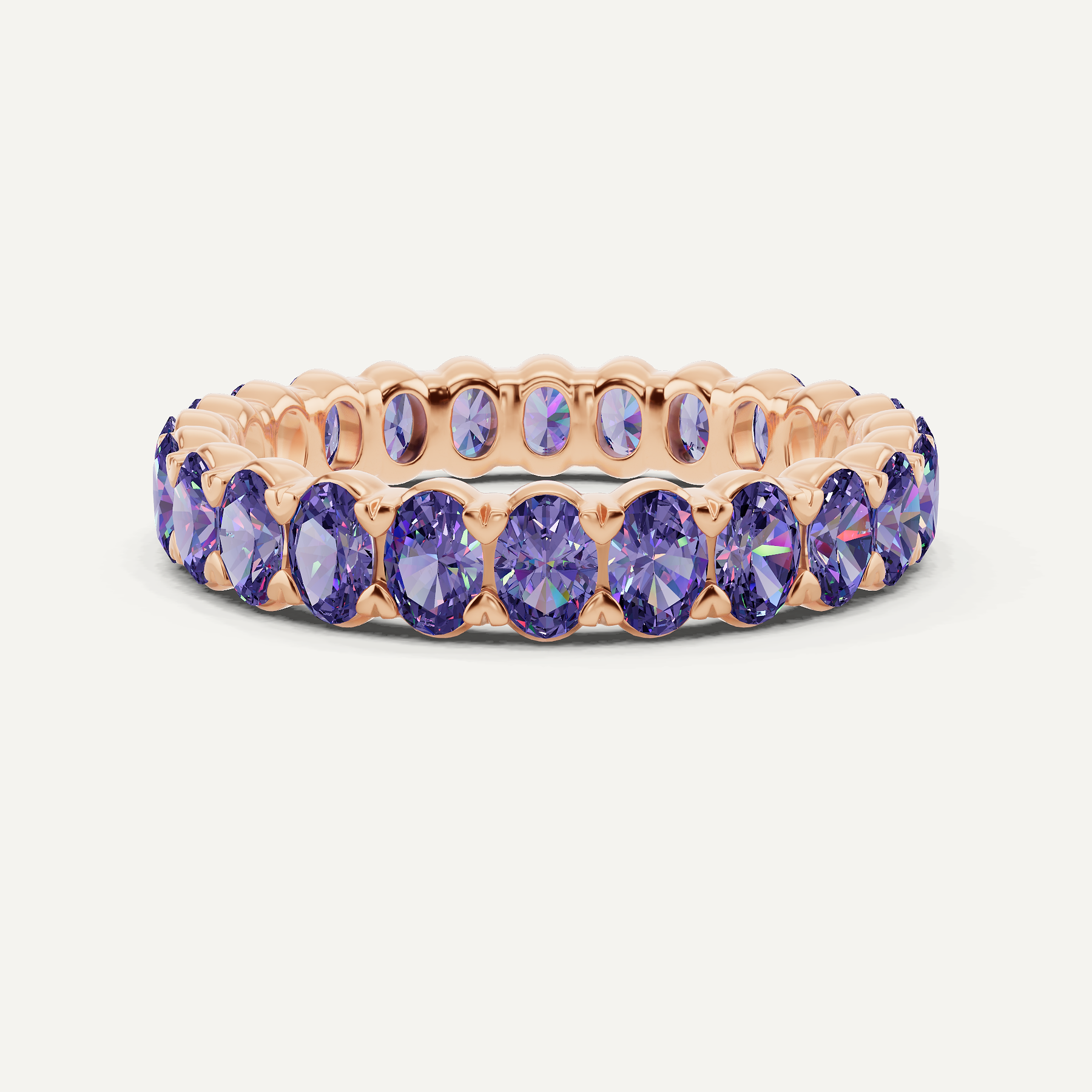 A poetic symphony of hues, this eternity band enchants with its perfect arrangement of oval-cut created alexandrites, carrying a 2.0 ctw of mesmerizing brilliance. Cradled in the warm embrace of 14K rose gold, its design speaks of endless devotion and artistry. With every glance, it becomes a treasure that echoes infinite connections and timeless allure.