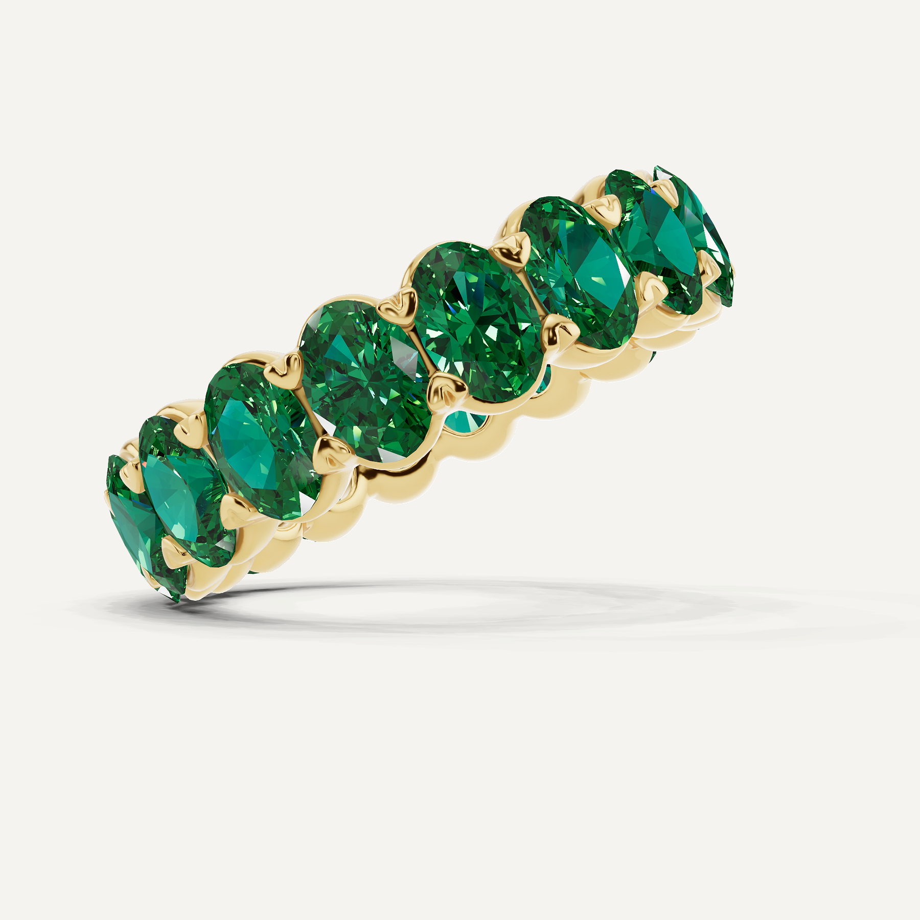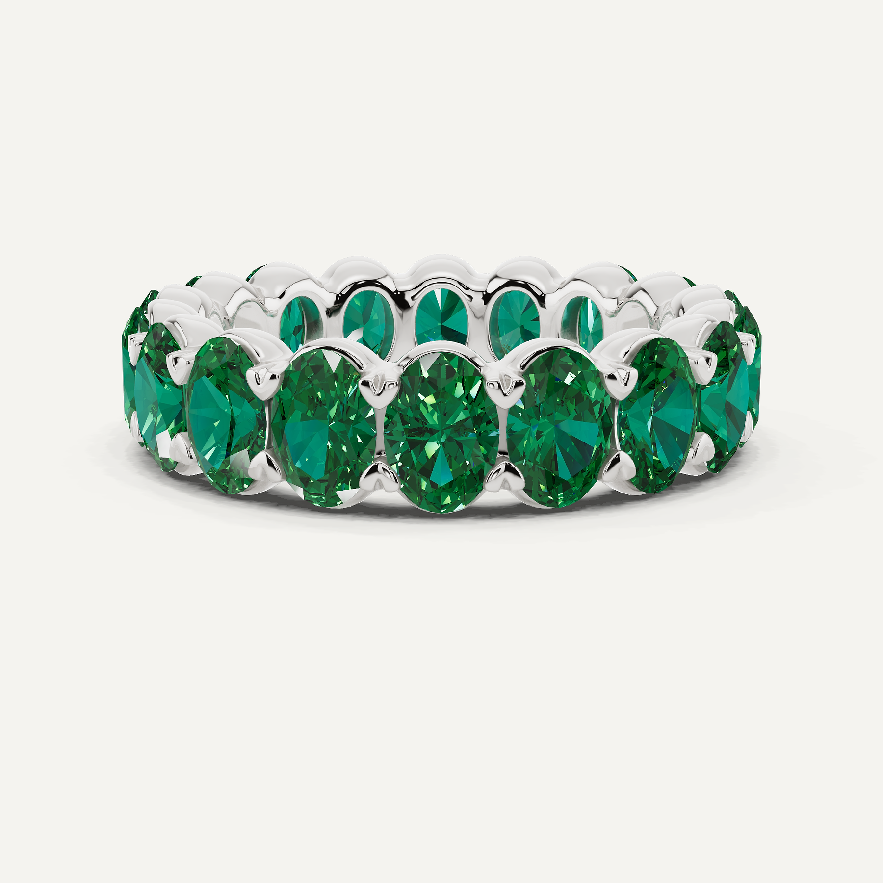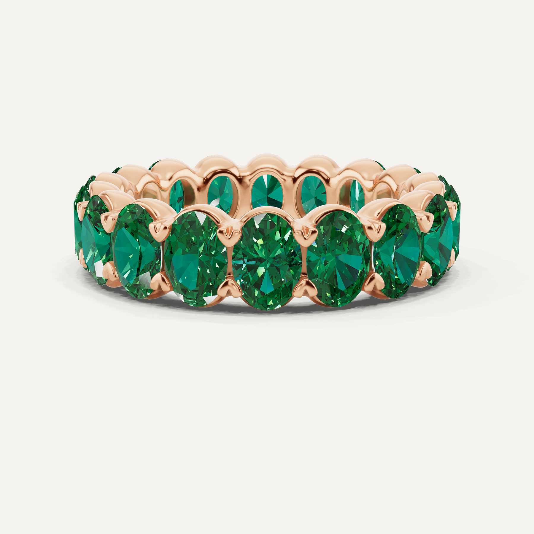 A continuous embrace of vivid green grace, this eternity band tells a story of enduring beauty and boundless passion. Each oval created emerald, totaling 4 ctw, is meticulously set against the warm glow of 14K rose gold, forming an unbroken circle of radiance. Designed with exceptional craftsmanship, it becomes a symbol of moments that last forever.