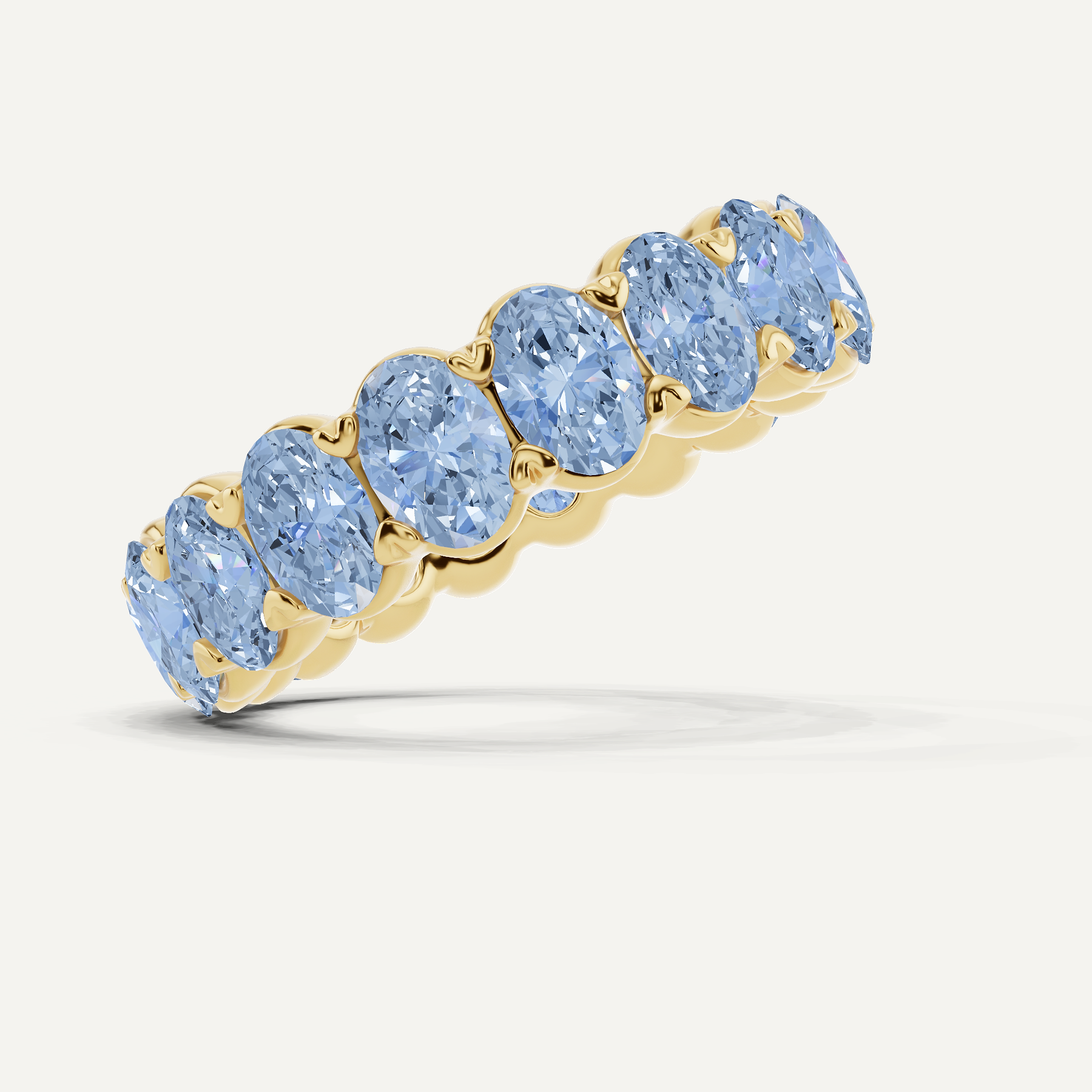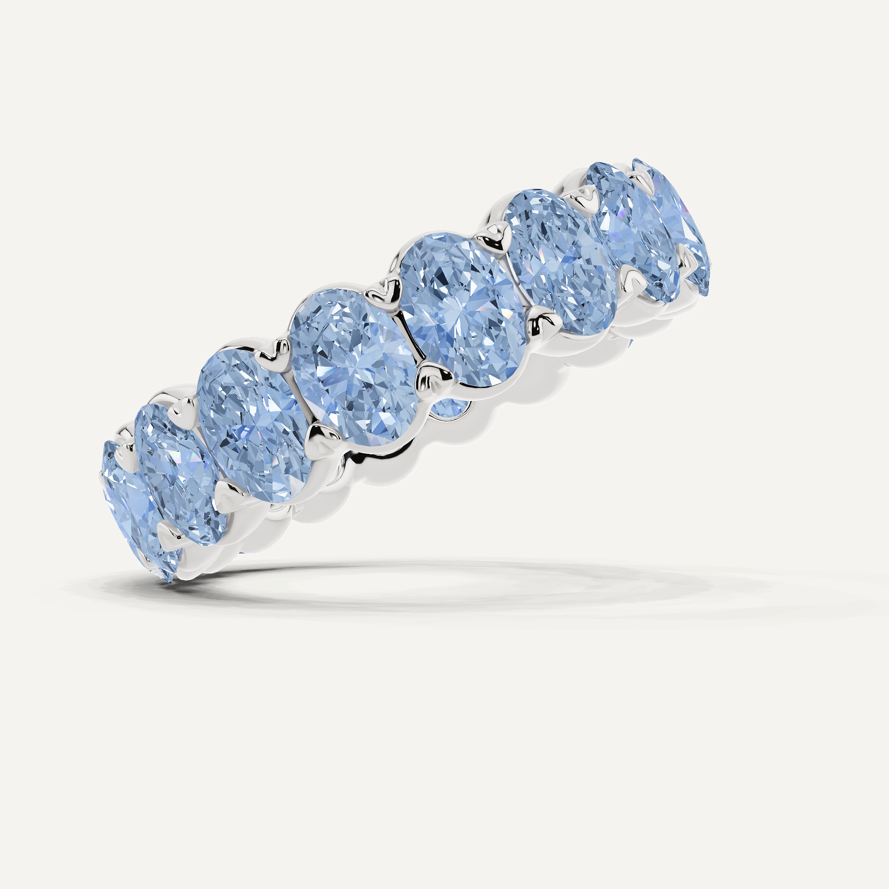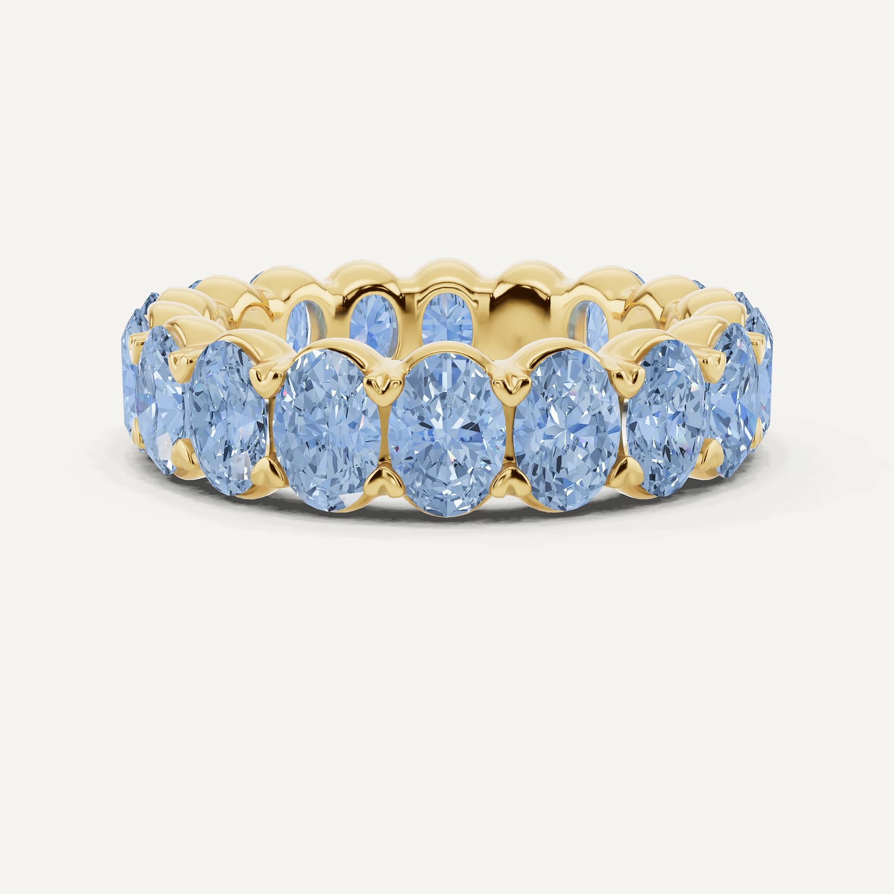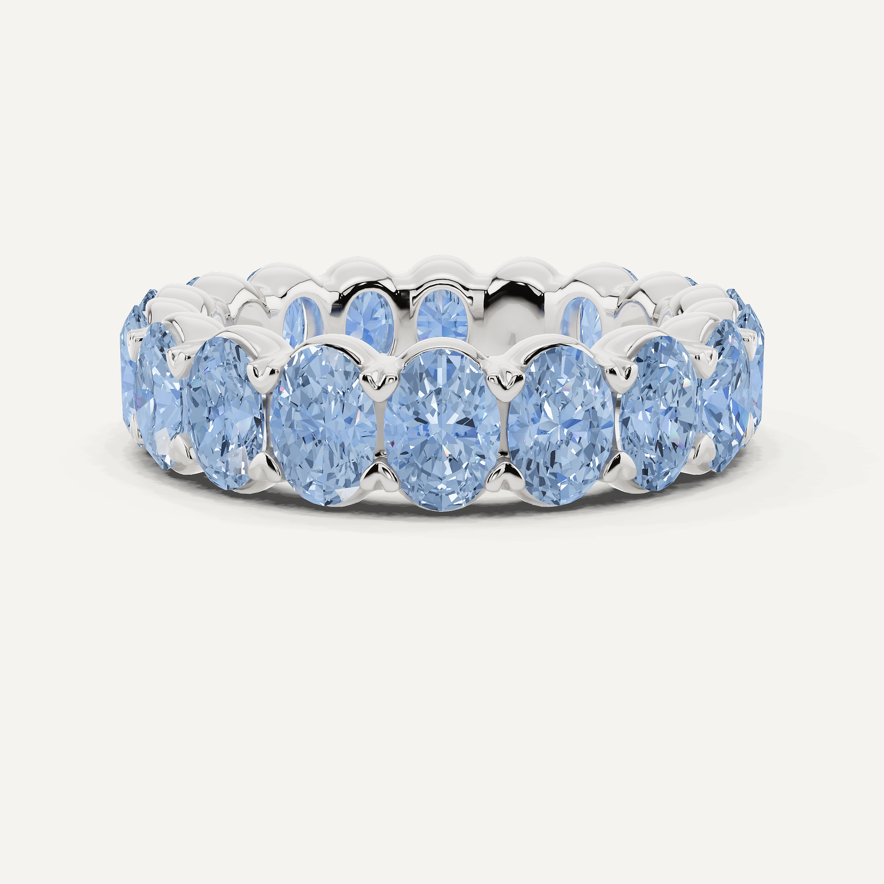 Encircling the finger with a serene cadence of oceanic hues, this eternity band showcases 5 ctw of oval lab created aquamarines, each stone cradled within the soft blush of 14K rose gold. A masterpiece of meticulous artistry, its seamless design evokes an infinite rhythm of tranquil beauty, celebrating craftsmanship and the grace of endless devotion. A band as enduring as the tides, it transforms moments into memories with every glance.