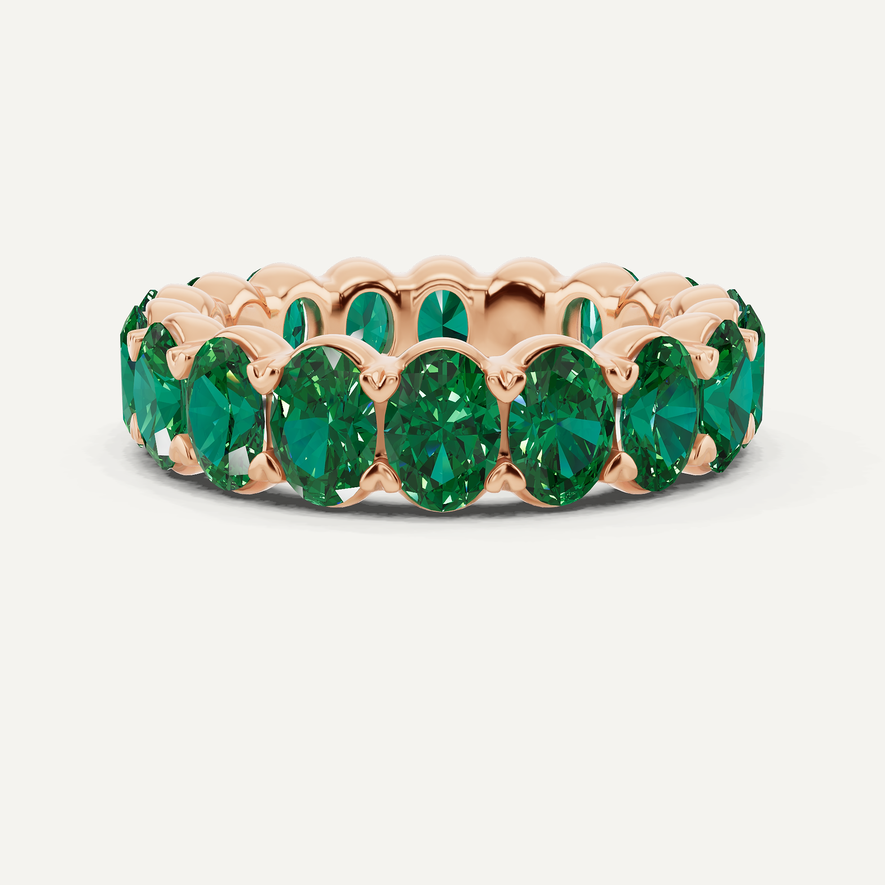 Encircling the finger with an endless loop of vivid green, this eternity band captures the essence of unbroken devotion. Crafted in 14K rose gold, each oval created emerald, totaling 5 ctw, is meticulously set to form a harmonious procession of brilliance. A testament to unparalleled artistry, this design transforms a simple band into a poetic declaration of endless passion.