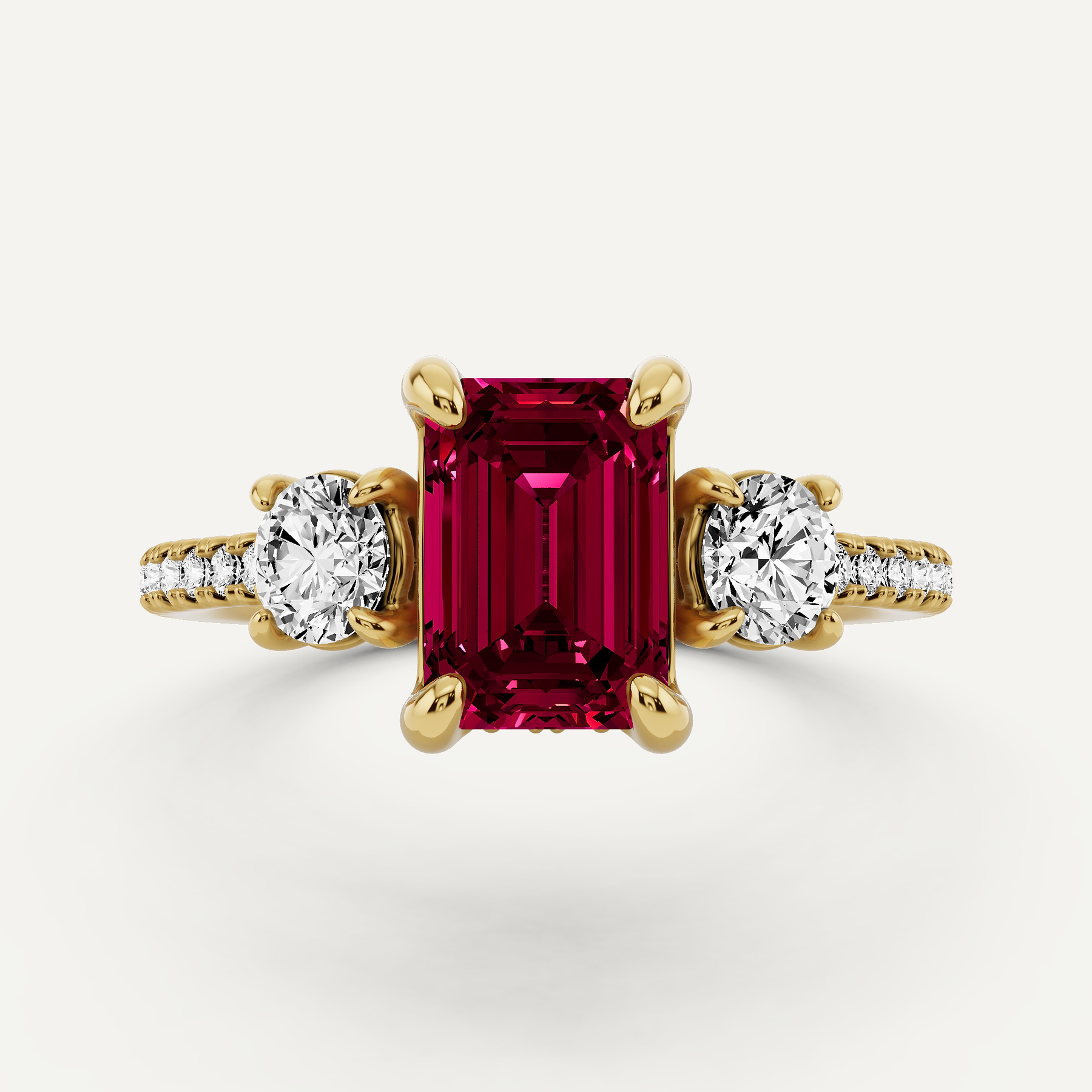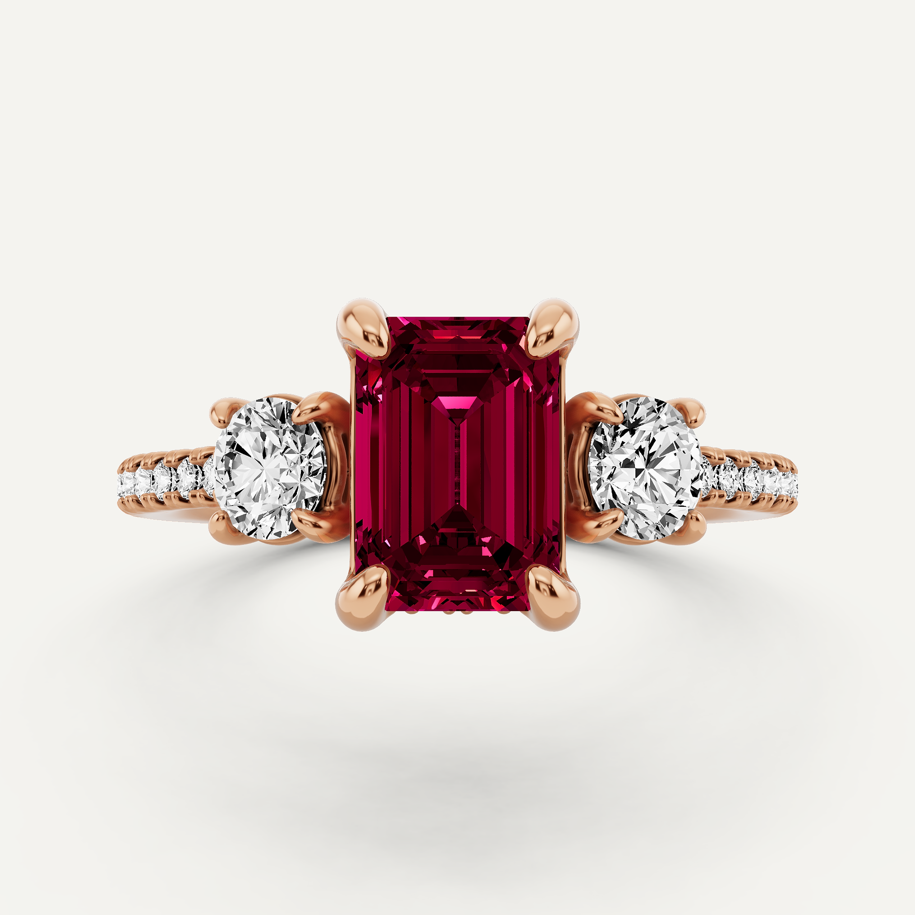 1 1/2 ctw Emerald Created Ruby Three Stone Engagement Ring with Round Side Stone