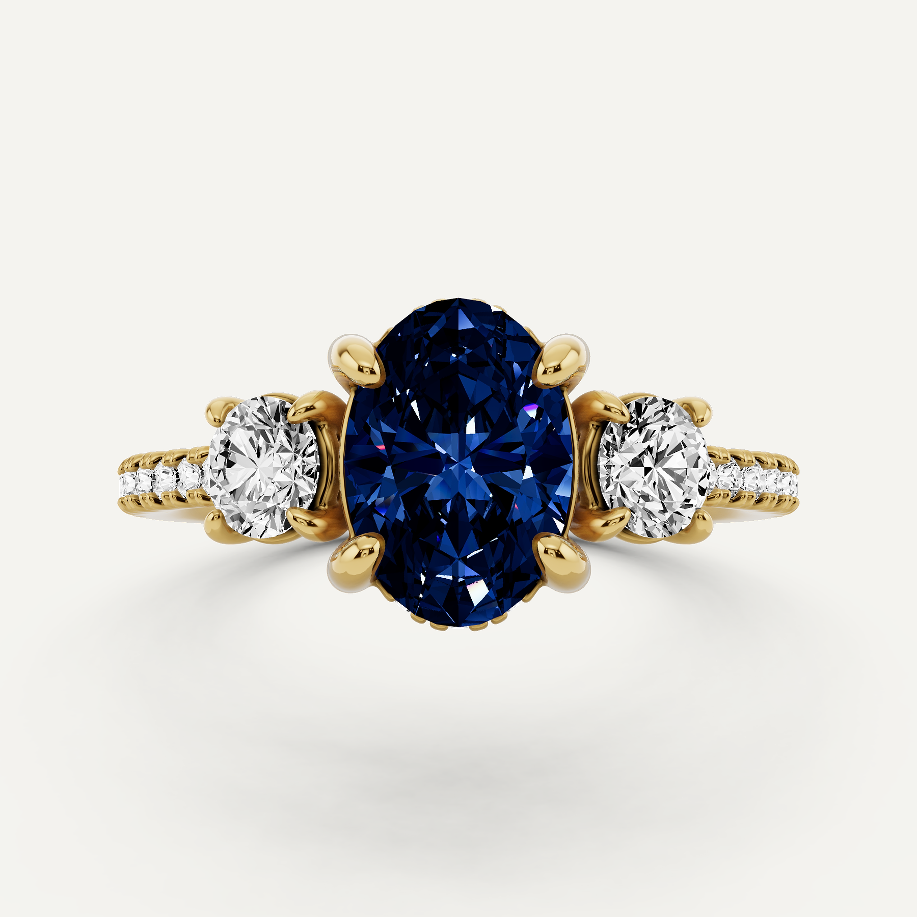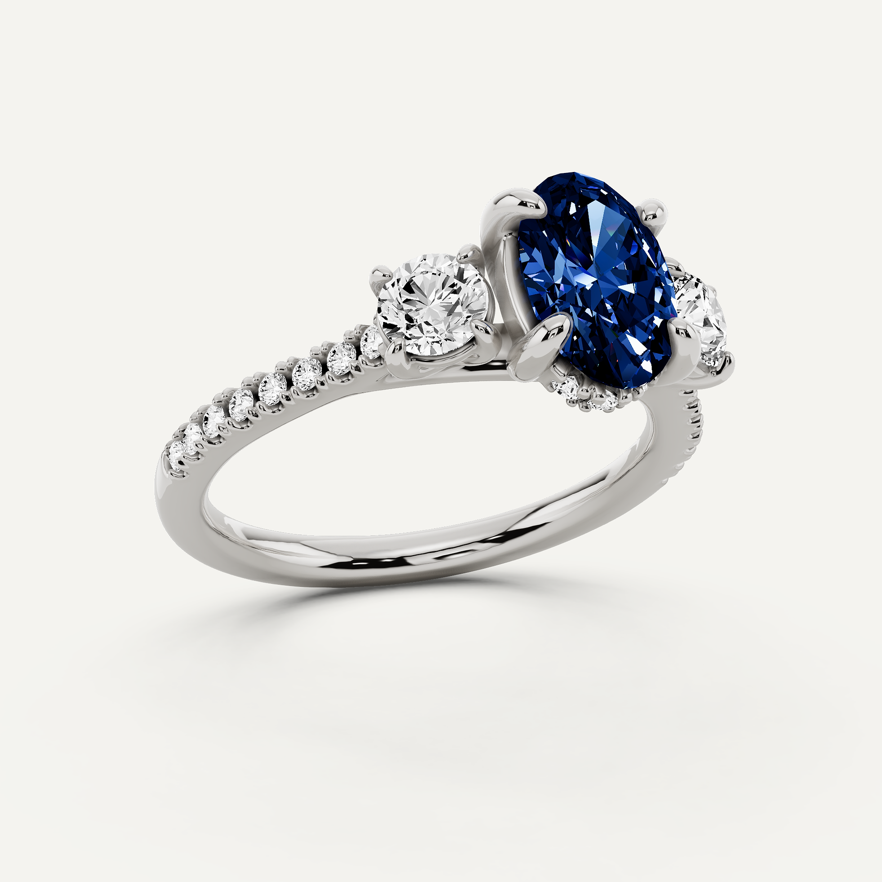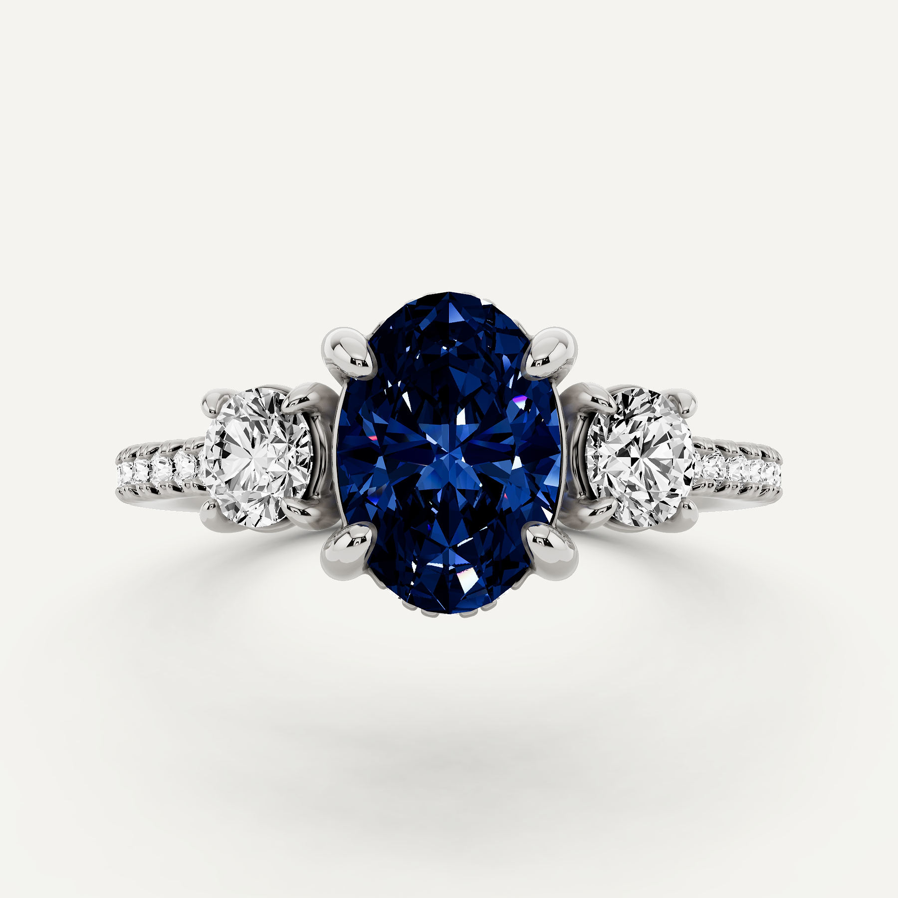 1 1/2 ctw Oval Created Sapphire Three Stone Engagement Ring with Round Side Stone