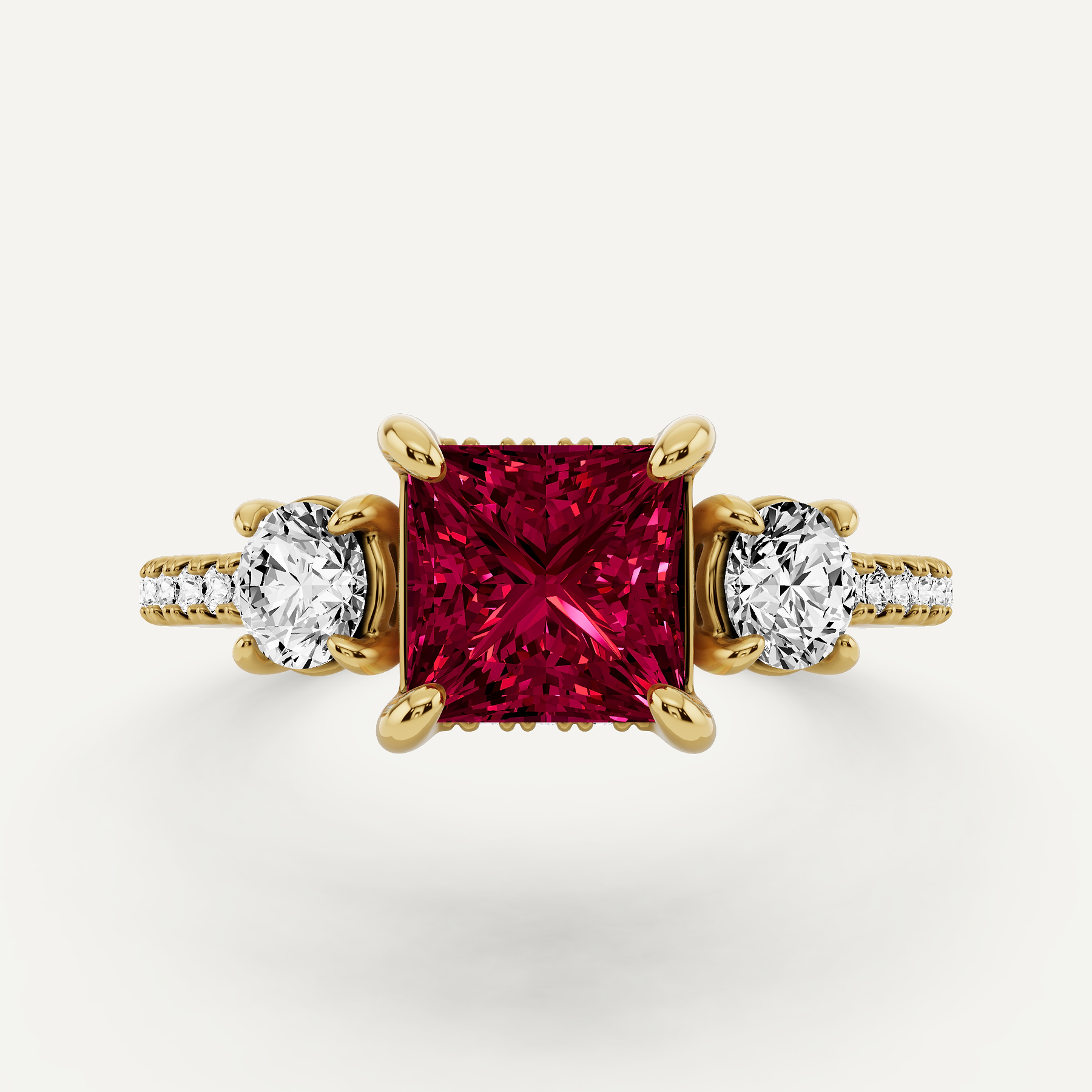 1 1/2 ctw Princess Created Ruby Three Stone Engagement Ring with Round Side Stone