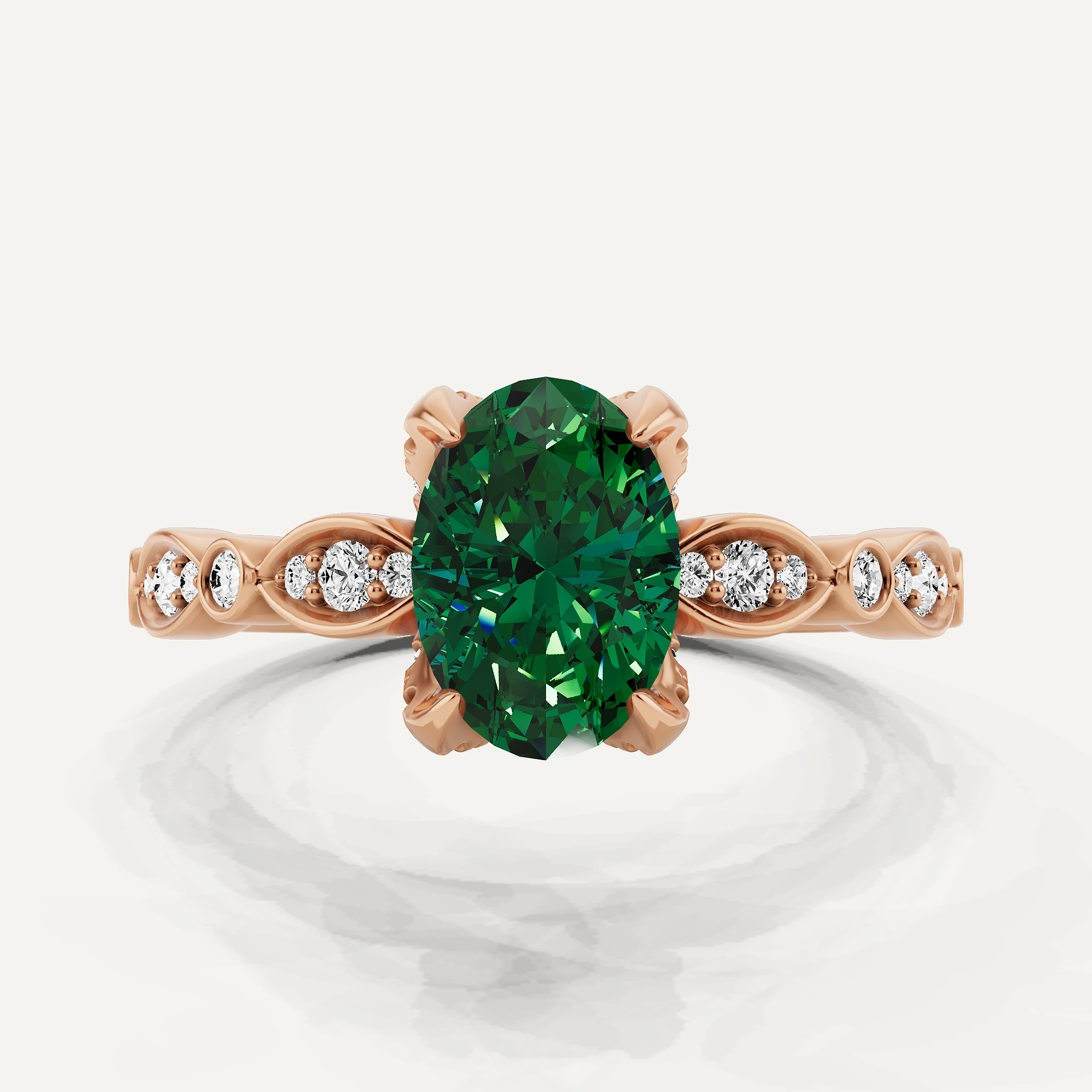 1 1/4 ctw Oval Created Emerald Hidden Halo Engagement Ring With Marquise Shape SIde Accents