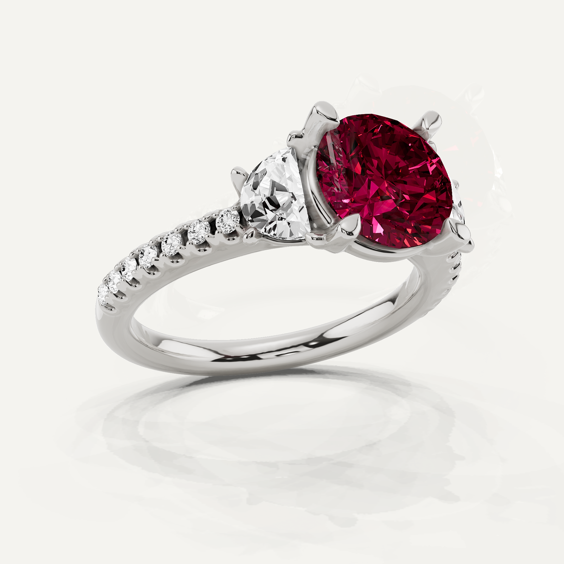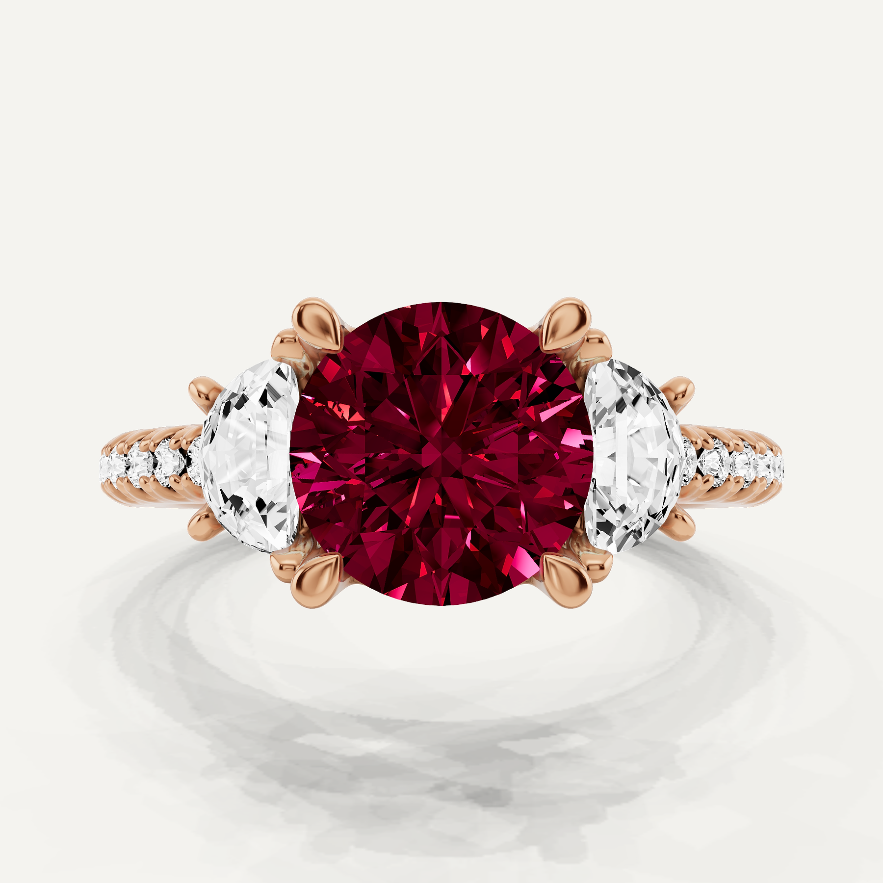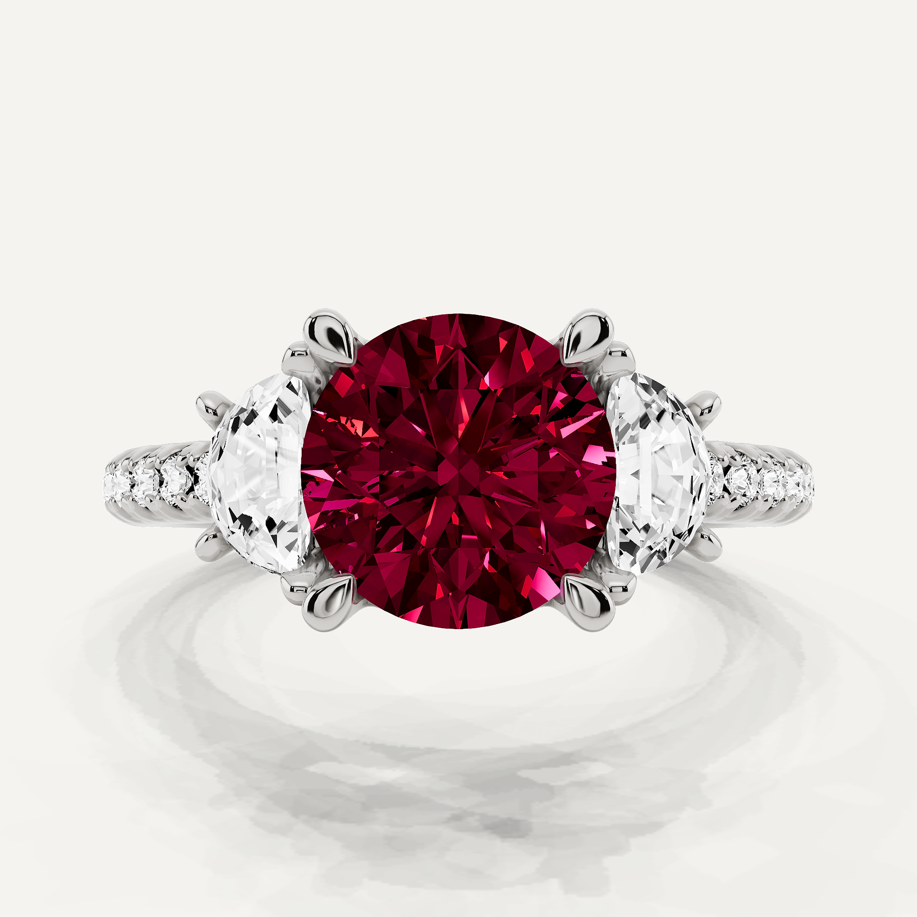 2 1/4 ctw Round Created Ruby Three Stone Engagement Ring With Half Moon Sides