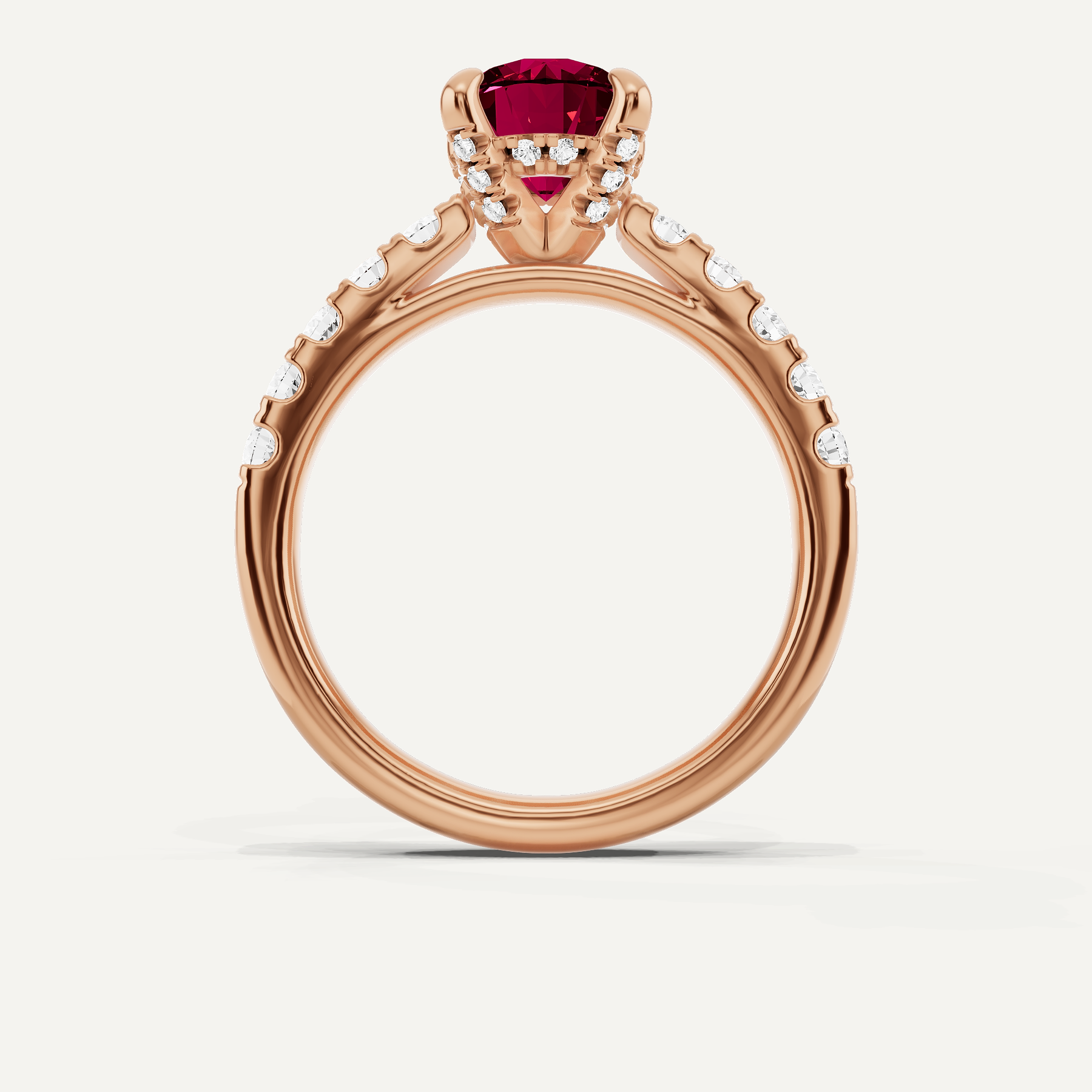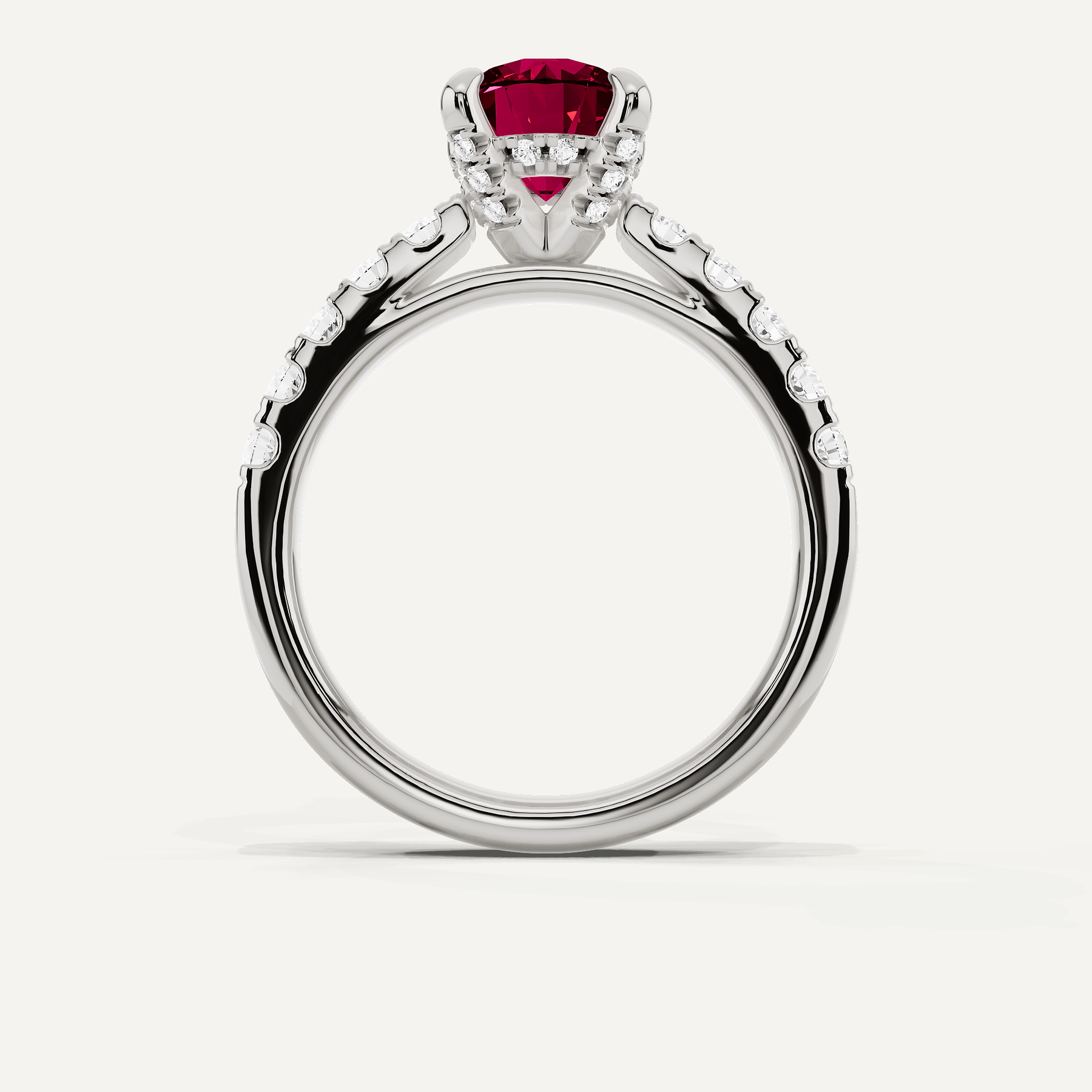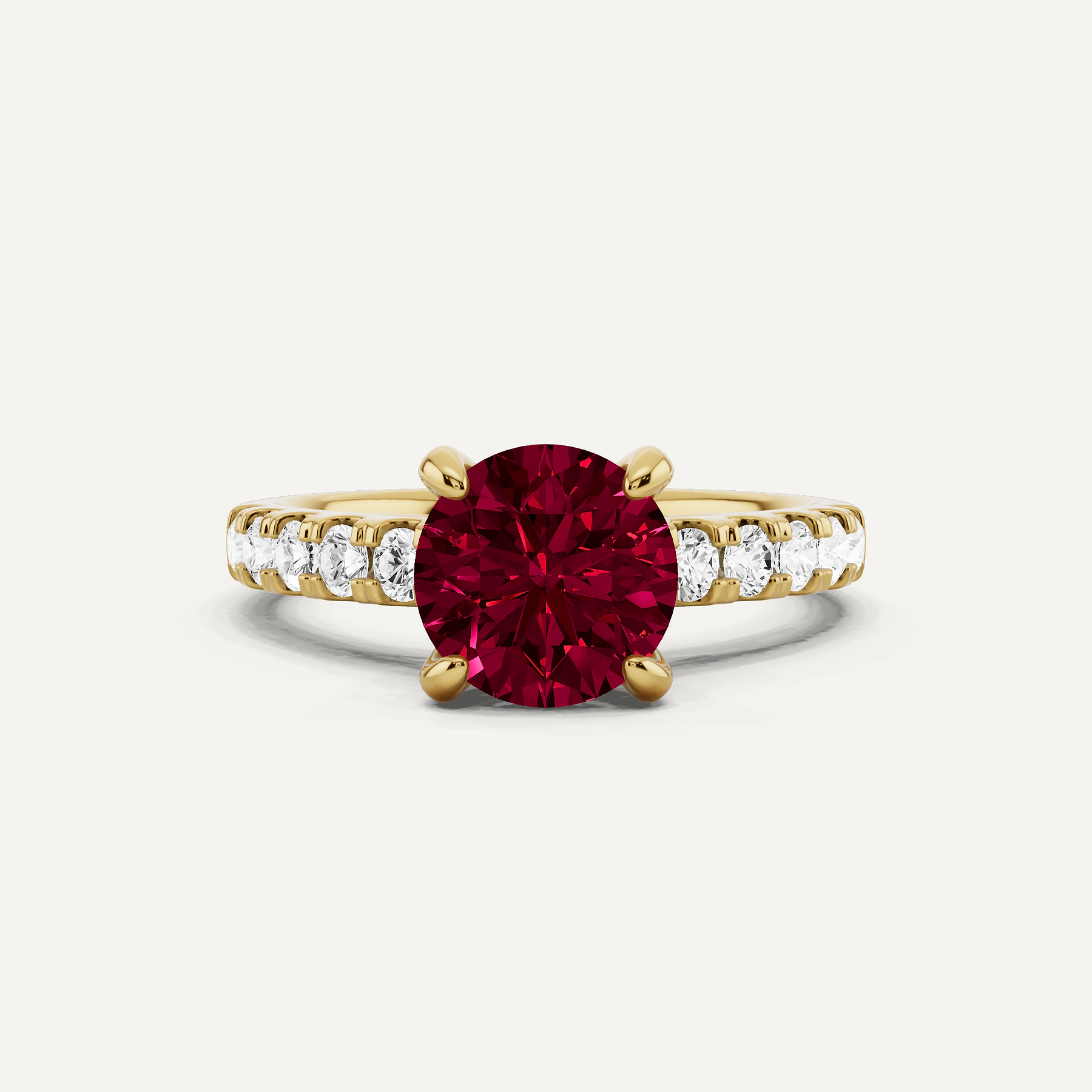 In the exquisite embrace of 14K yellow gold, a 2.4 ctw round lab-created ruby unveils its fiery heart, glowing with timeless allure. A delicate hidden halo accent whispers beneath the ruby, a secret flourish crafted to elevate its radiance—an ode to the quiet beauty of masterful design. This ring is a celebration of passion and artistry, perfect for marking a love that defies the ordinary.