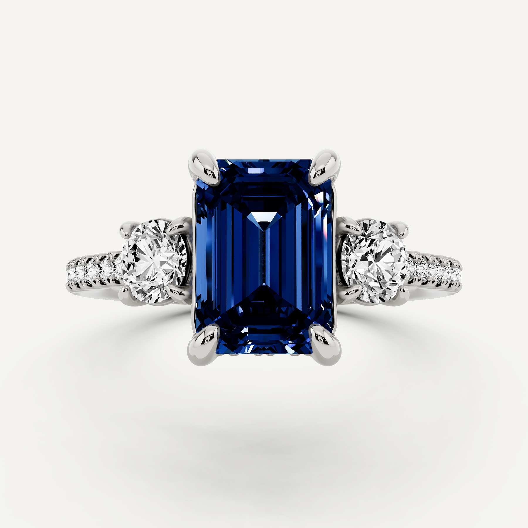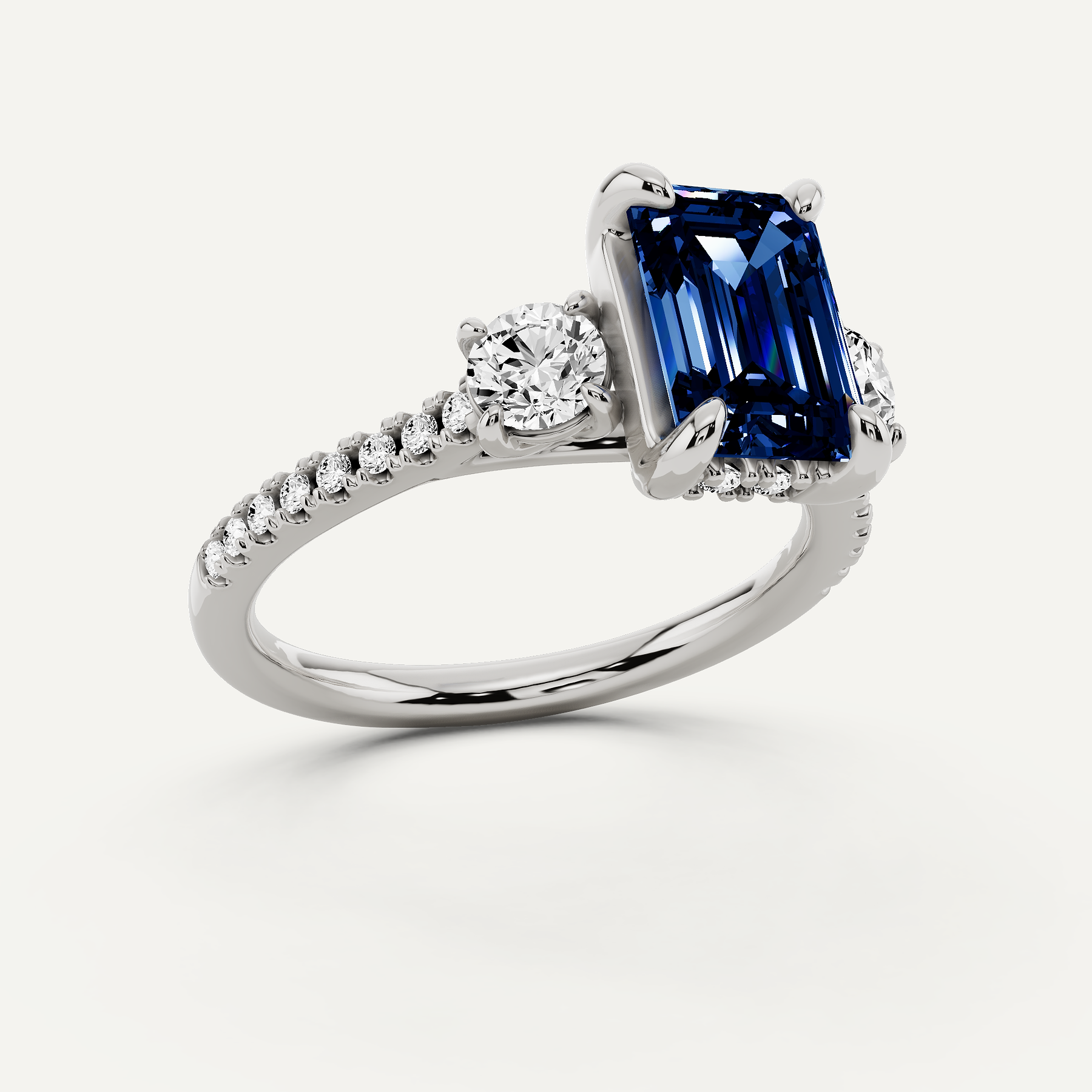 2 ctw Emerald Created Sapphire Three Stone Engagement Ring with Round Side Stone