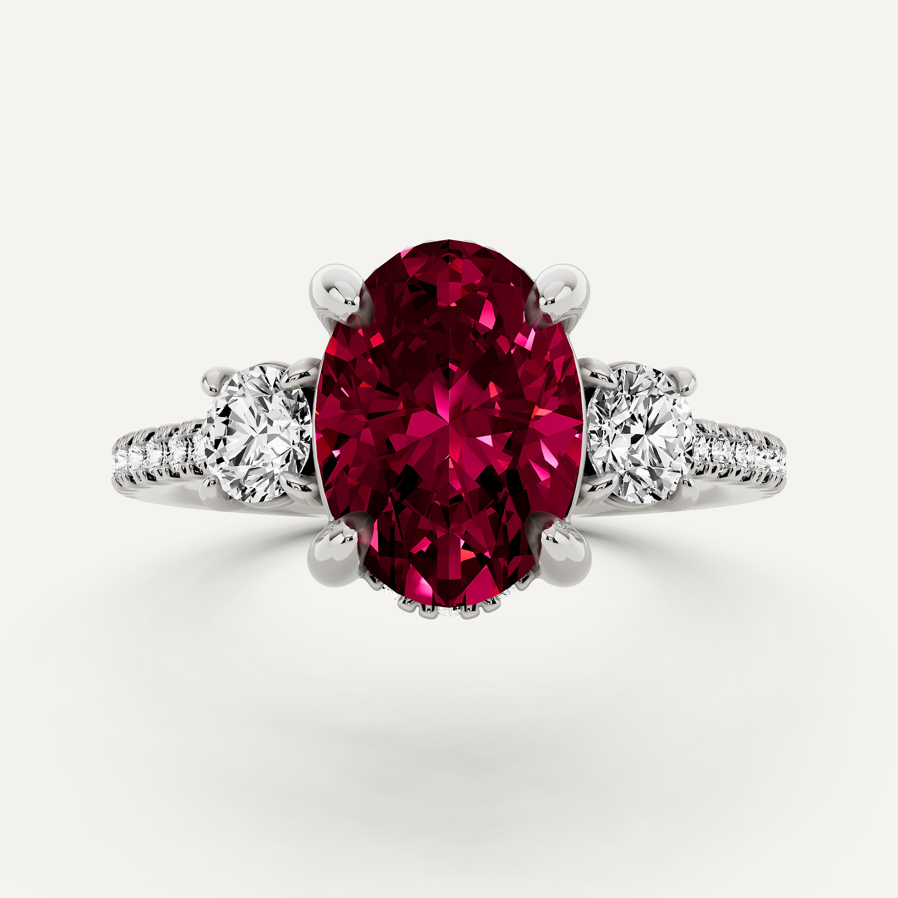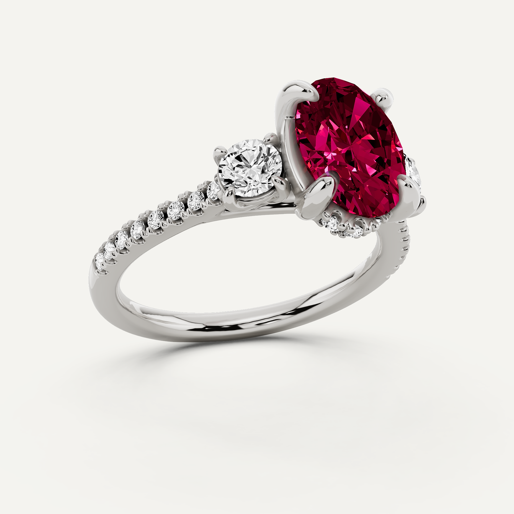 2 ctw Oval Created Ruby Three Stone Engagement Ring with Round Side Stone