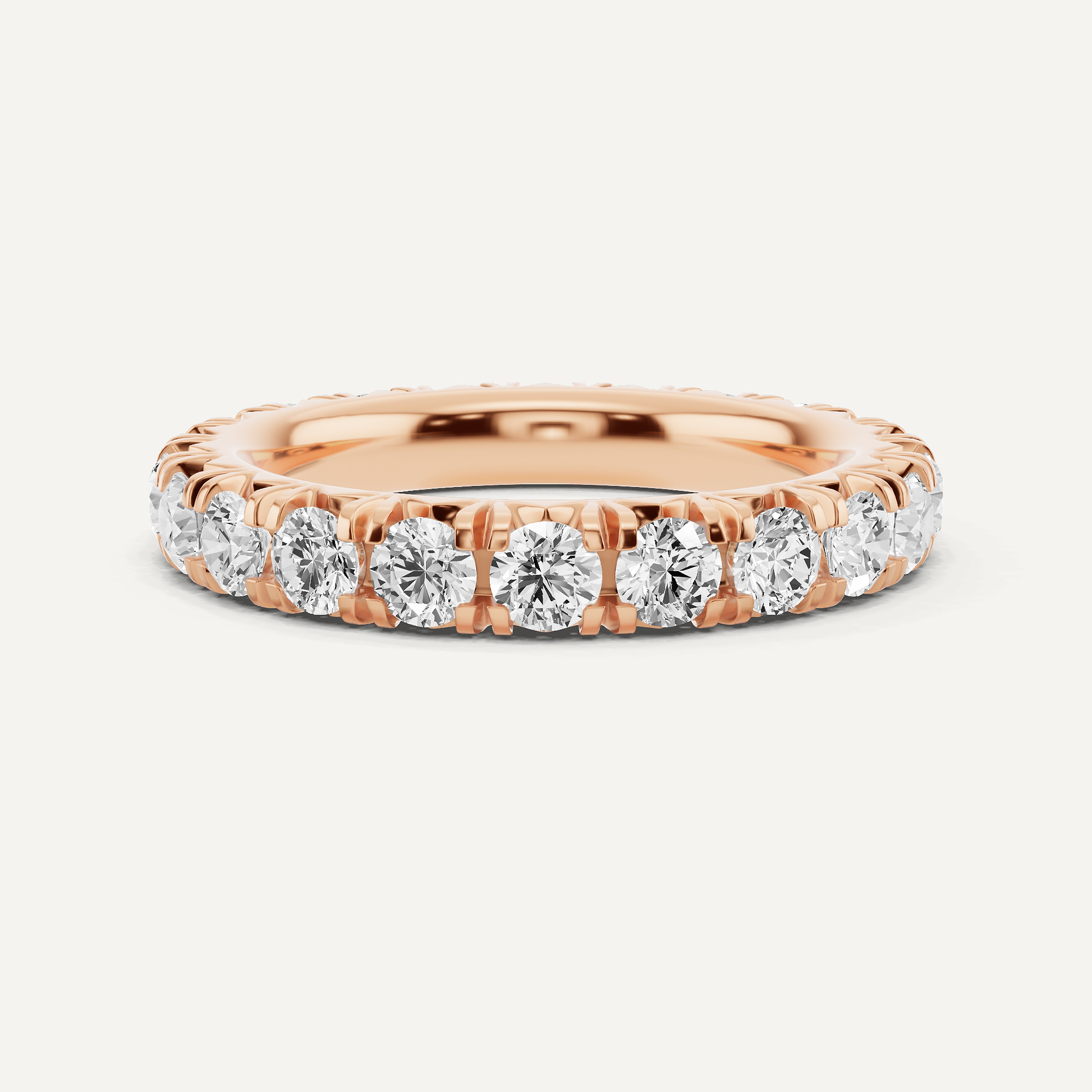 Revel in the charm of our Round Diamond French Pave Eternity Band. The French pave setting enhances the brilliance of each diamond, creating a romantic and affordable option for those seeking an eternity band that sparkles with sophistication.