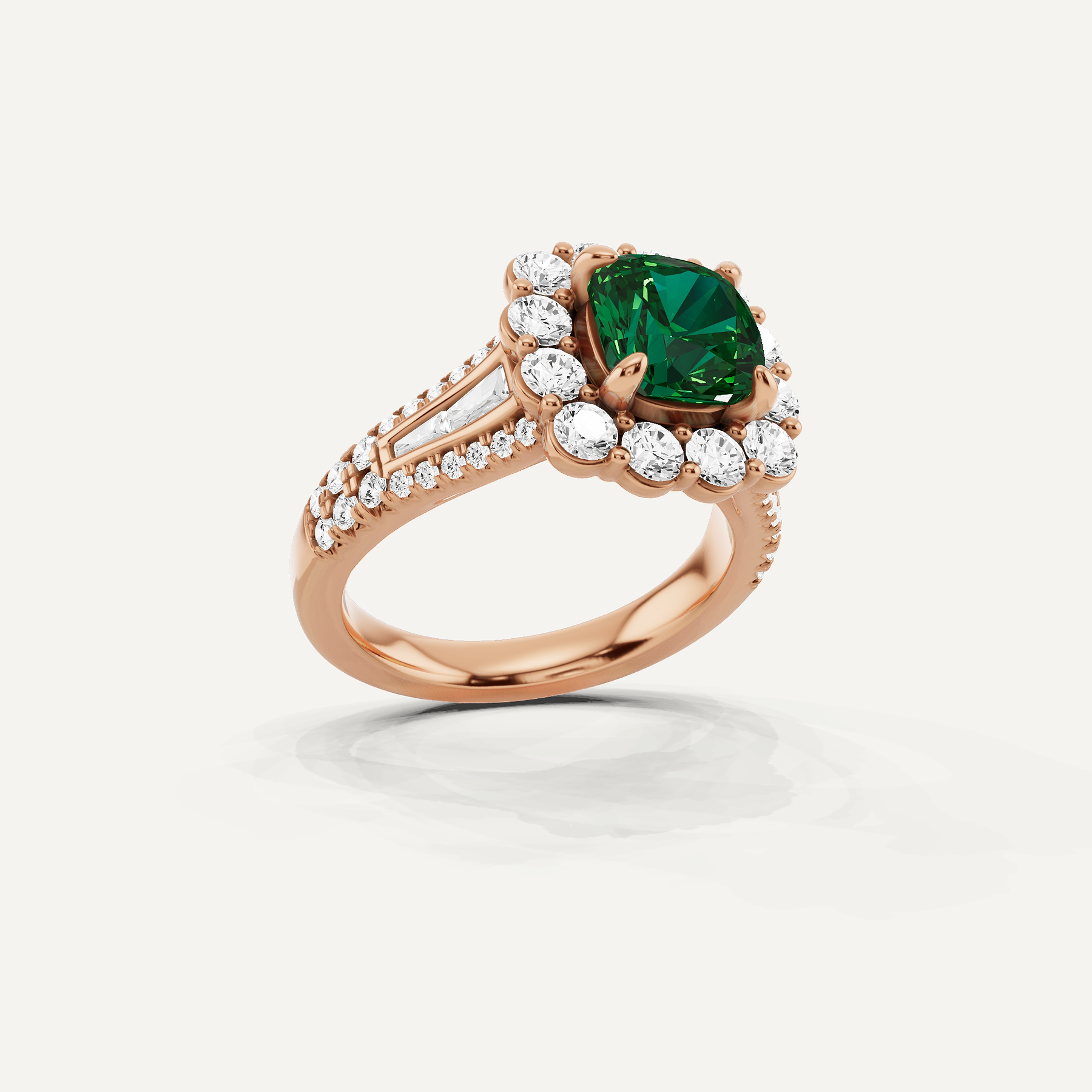 A celebration of artistry and light, this 14K white gold engagement ring enchants with its centerpiece—a 3 2/5 ctw cushion-shaped lab-created emerald. Framed by a halo of intricate detailing, the ring speaks of eternal love and the lasting allure of masterful craftsmanship. Each facet and curve harmonizes, creating a piece that captures the depth and brilliance of devotion.