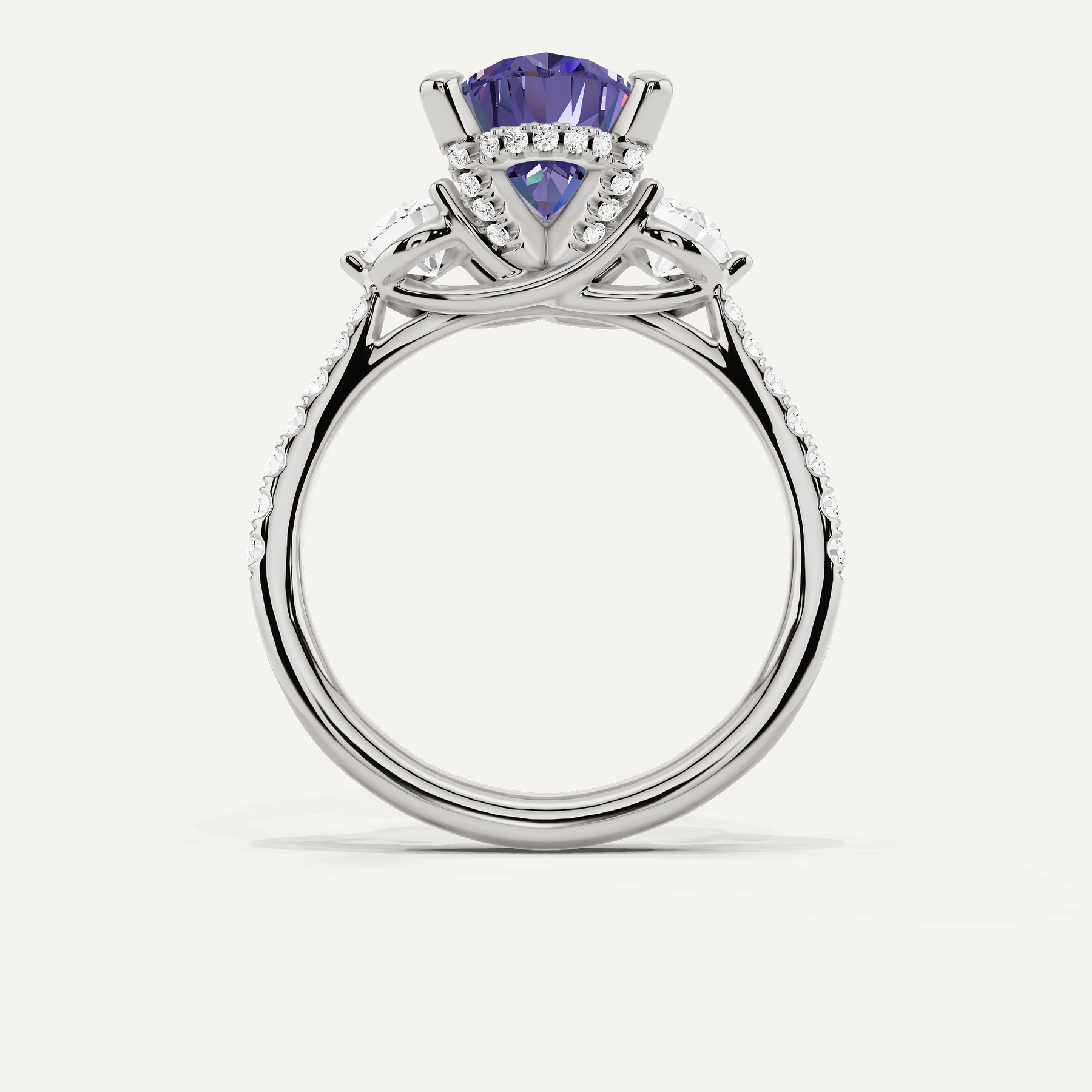 3 3/4 ctw Pear Created Alexandrite Three Stone Hidden Halo Engagement Ring with Side Accent