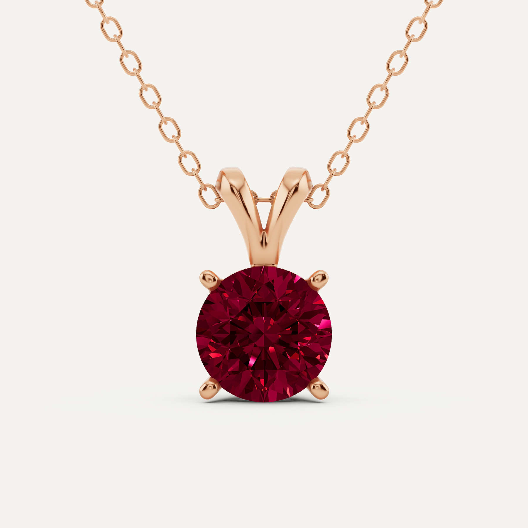 A single round lab grown ruby, imbued with a fire akin to the dawn's first light, rests gracefully within this split bail solitaire pendant. Crafted in warm 14K rose gold, its design draws upon the timeless allure of simplicity, showcasing the 1 ctw ruby as it floats effortlessly on the neckline. Every element speaks to expert artistry, where every curve and setting is a whisper of enduring beauty.